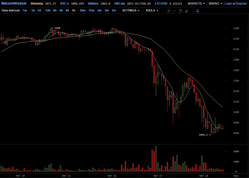 За последние два дня цена биткоина на фоне жарких дебатов о возможном хардфорке сети упала в общей сложности на 17%. Минимальные значения были зафиксированы в ночь на субботу, когда цена первой криптовалюты опускалась до $1052 на Bitfinex и $1056 на Bitstamp.
