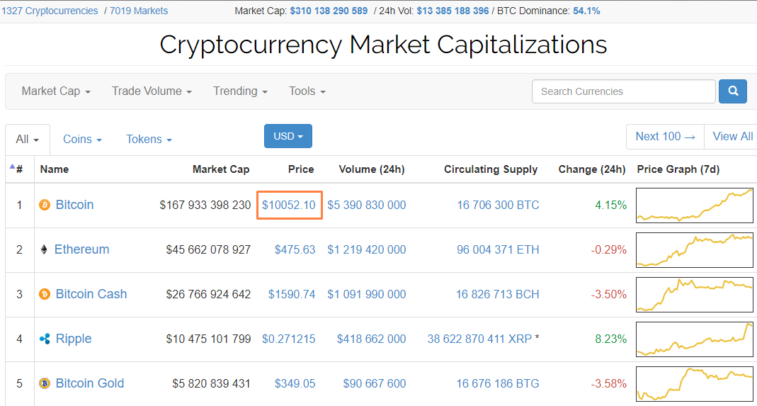 Так, по данным аналитического сервиса Coinmarketcap, в настоящий момент средневзвешенная цена “цифрового золота” находится в районе $10 050.