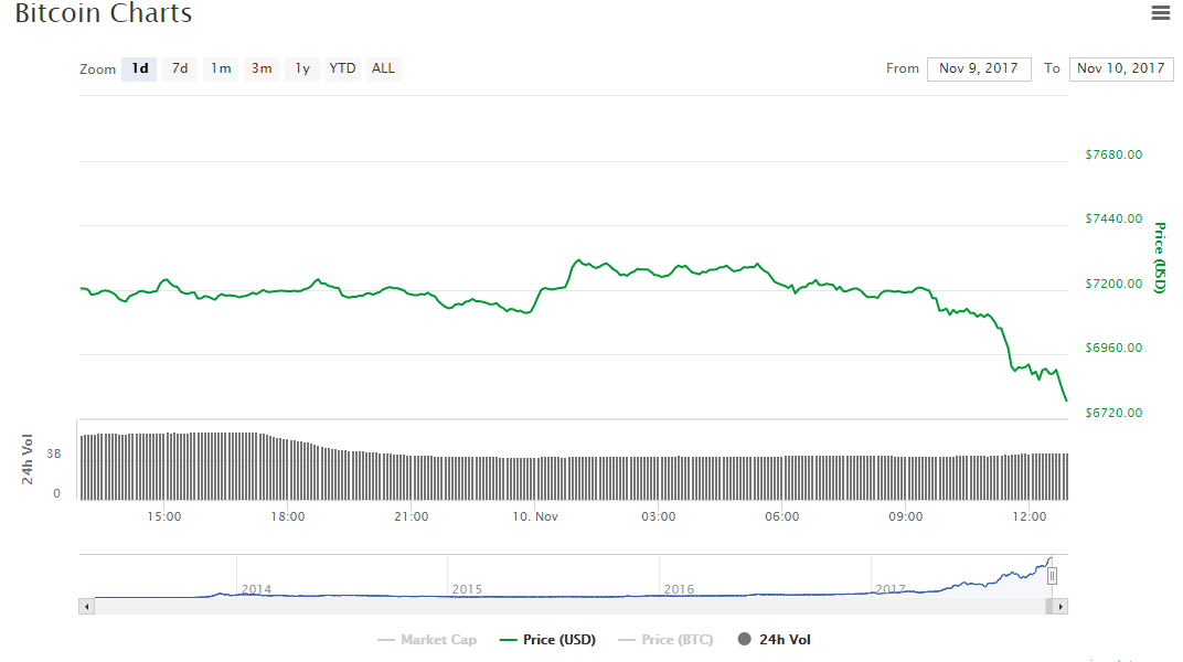 В пятницу, 10 ноября, цена биткоина стремительно пошла вниз, опустившись к 12:00 UTC ниже $6800. По данным Coinmarketcap, средневзвешенный курс первой криптовалюты на этот момент составлял $6788, при этом на целом ряде бирж цена упала еще ниже.