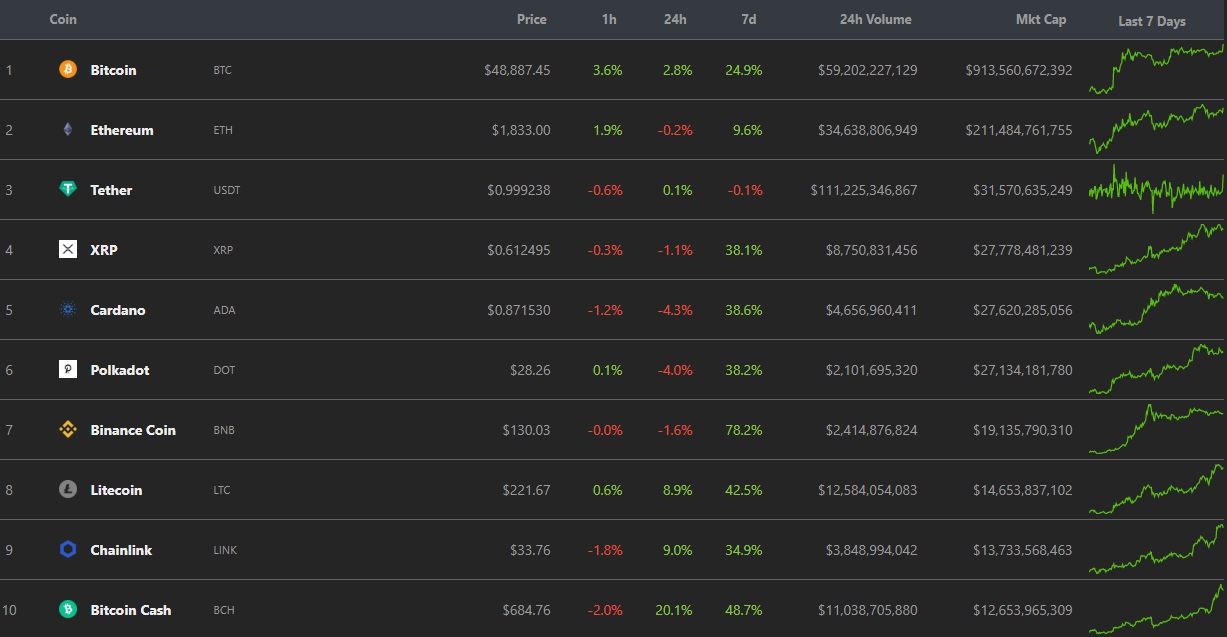 Токен XRP от Ripple  вернулся на четвертую строчку рейтинга по совокупной рыночной стоимости. По данным агрегатора, цена биткоина достигла отметки $49 067.