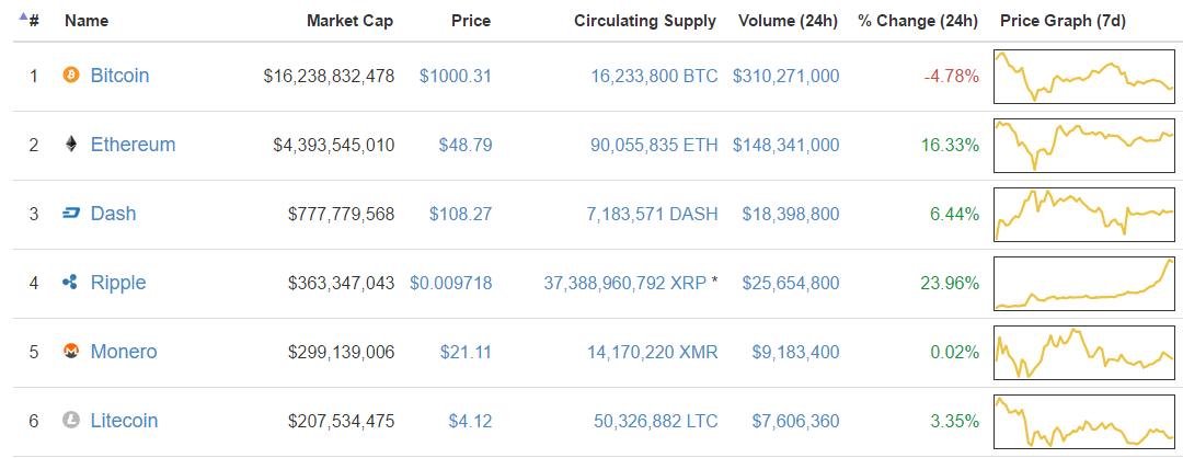Цена биткоина вновь опустилась ниже $1000