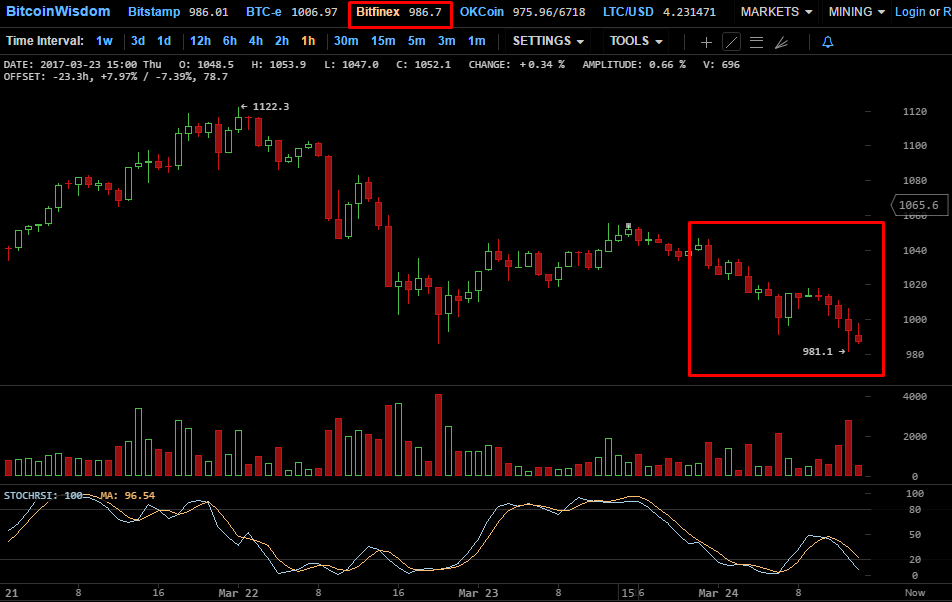 Цена первой цифровой валюты стремительно снижается на фоне роста спроса на альткоины. Отчетливее всего падение заметно на часовом графике биржи Bitfinex, где биткоин в настоящее время торгуется в диапазоне $970-990.