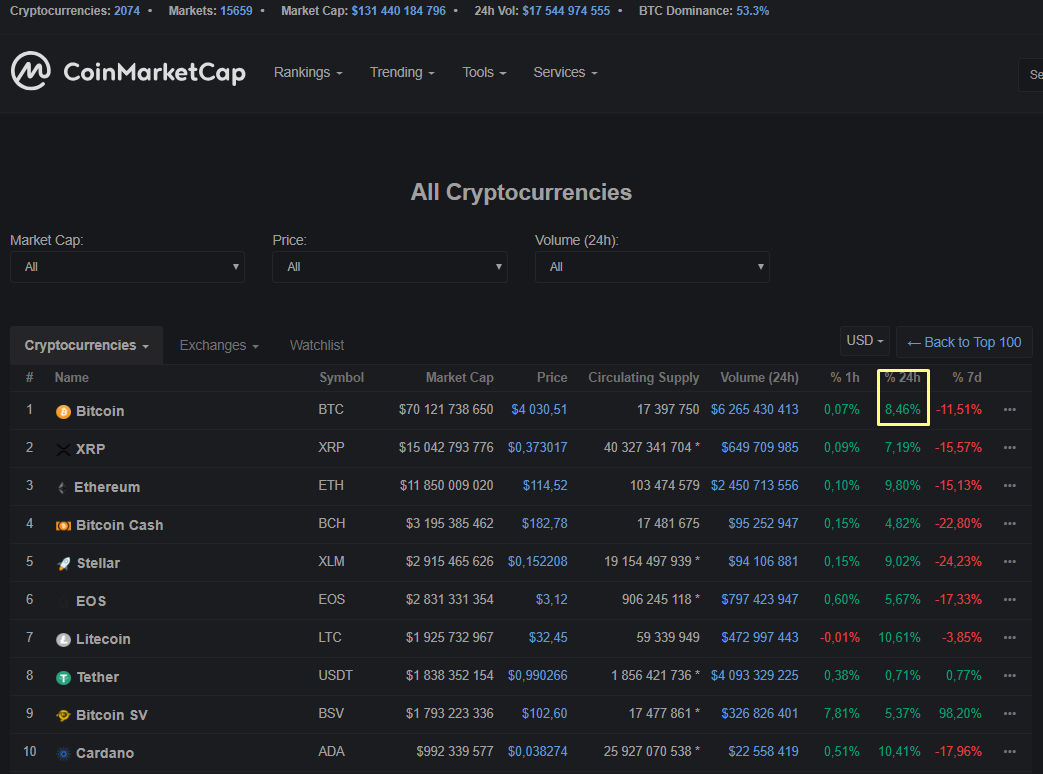 По данным CoinMarketCap, за последние сутки «цифровое золото» выросло более чем на 8%, подтолкнув вверх цены менее капитализированных активов: