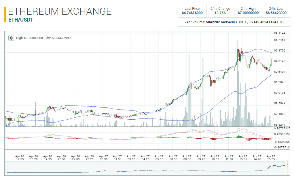 За последние два дня цена второй по капитализации криптовалюты Ethereum поднялась более чем на 20%, достигнув в какой-то момент отметки в $67 на бирже Poloniex. Это новый исторический максимум Ethereum по отношению к доллару.