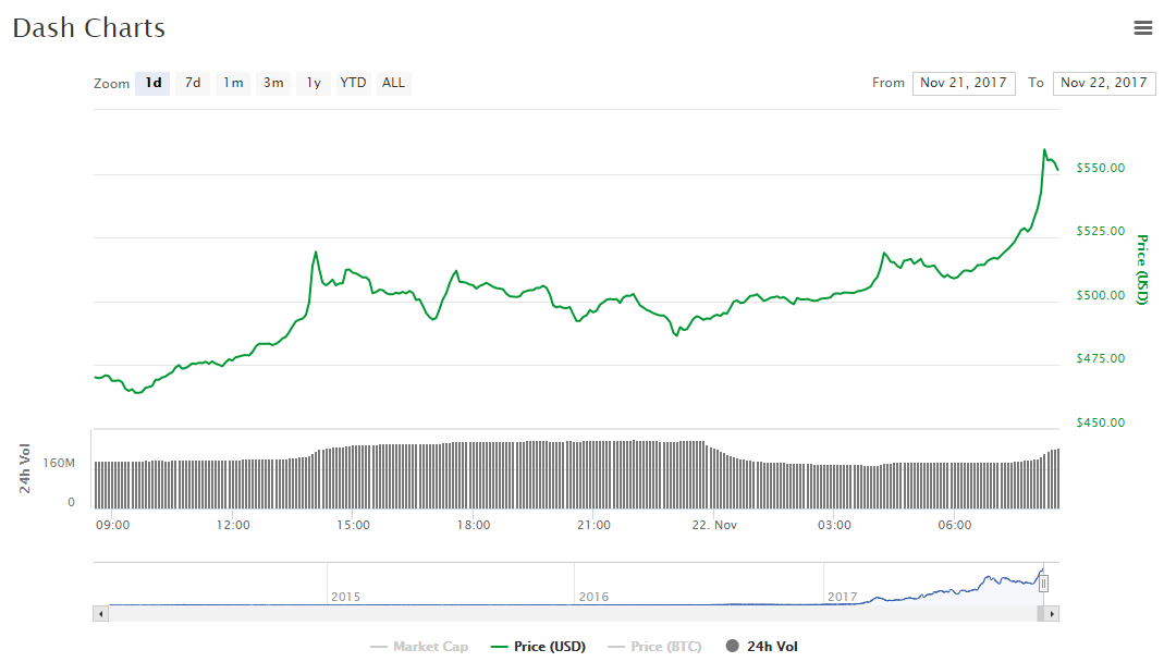 В среду, 22 ноября, цена криптовалюты Dash обновила новый исторический максимум, впервые превысив отметку в $570.