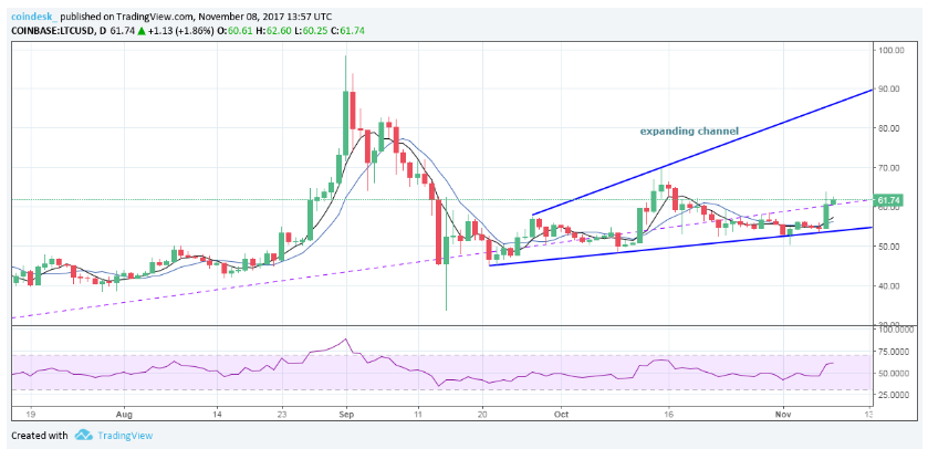 На протяжении большей части прошлого месяца Litecoin находился в расширяющемся канале нижняя граница которого проходит у отметки $50 и выше, представляя собой прочный уровень сопротивления. В настоящее время цена криптоактива находится в районе $61-62.