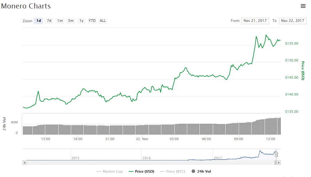 В среду, 22 ноября, криптовалюта Monero вышла на новый исторический рекорд, уверенно преодолев рубеж в $155. Чуть ранее разработчики популярного аппаратного кошелька Ledger подтвердили скорую интеграцию Monero, Qtum и Stellar в устройства моделей Nano S and Blue.
