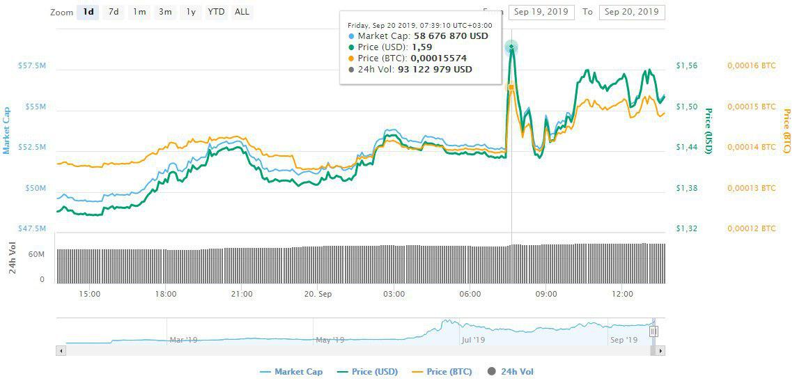После объявления в 10:25 (МСК) о листинге на бирже цена токена выросла на 11,5% с $1,43 до $1,59 (по данным CoinMarketCap). На момент написания материала монета торговалась на уровне $1,52.