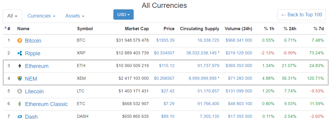 По рыночной капитализации Ethereum все еще уступает Ripple, в то время, как криптовалюте NEM (XEM) удалось потеснить Litecoin и занять 4-ую позицию рейтинга. Всего за последнюю неделю New Economy Movement вырос на 120% и сейчас средневзвешенная цена XEM составляет примерно $0,26.