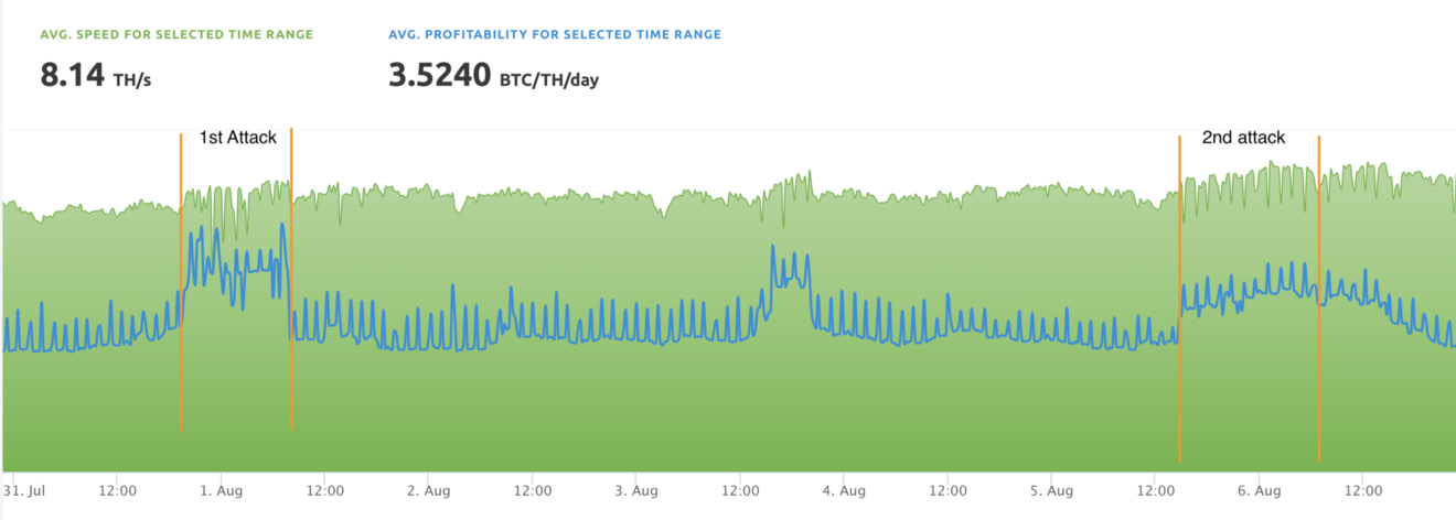 Цена и TH/сек на NiceHash во время первой и второй атаки