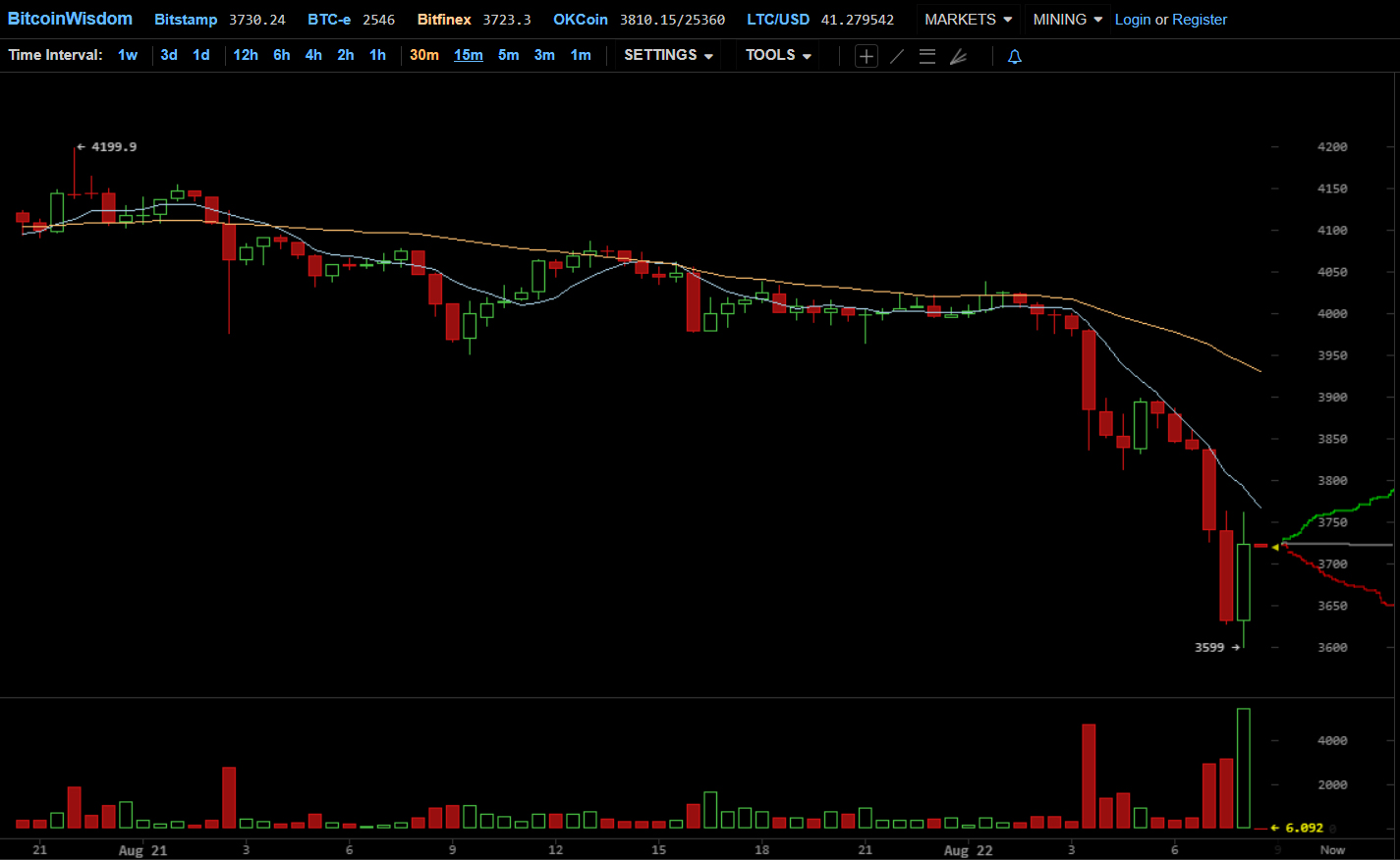 В ночь на вторник, 22 августа, цена биткоина, продержавшись большую часть понедельника в районе $4000, стремительно пошла вниз, опустившись до отметок ниже $3700. Последний раз на этом уровне первая криптовалюта торговалась 12 августа.