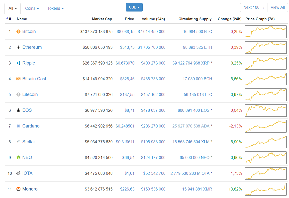 Войти в первую десятку рейтинга Coinmarketcap это Monero, впрочем, не помогло, и монета по-прежнему несколько отстает от расположившейся строчкой выше IOTA.
