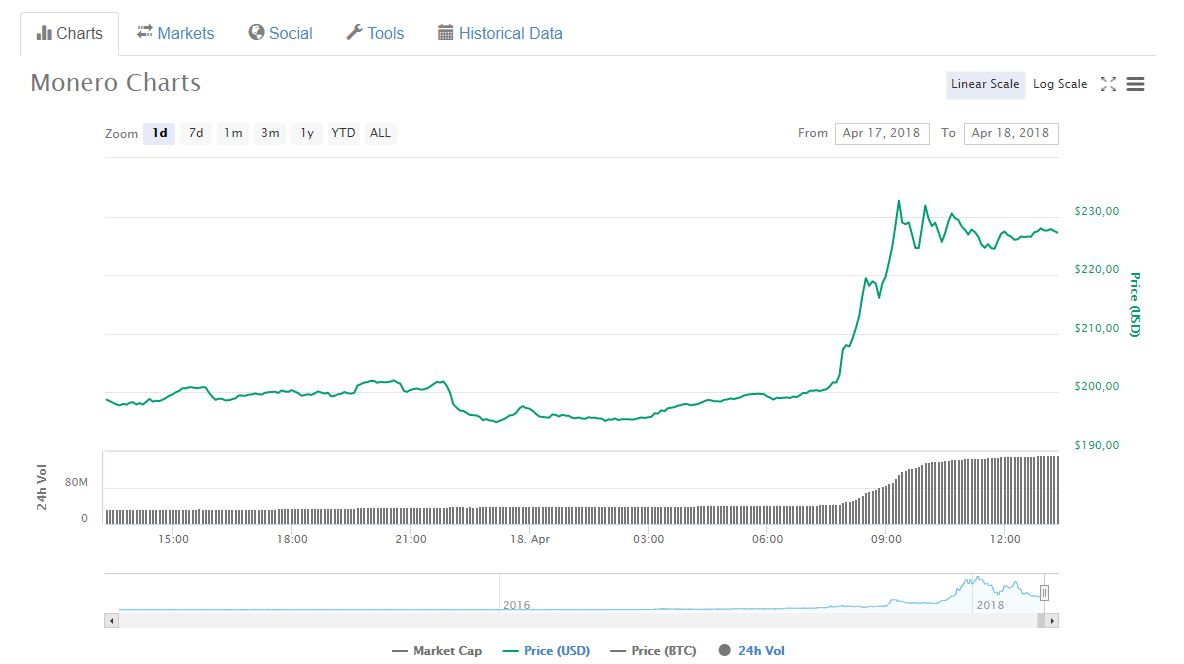 Движение вверх XMR начала около 8:00 по Москве, всего за час с небольшим поднявшись с отметок около $200 до $232. Соответственно, выросла и капитализация криптовалюты – если в начале указанного периода этот показатель составлял 3,2 млрд, впоследствии он поднялся до 3,6 млрд.