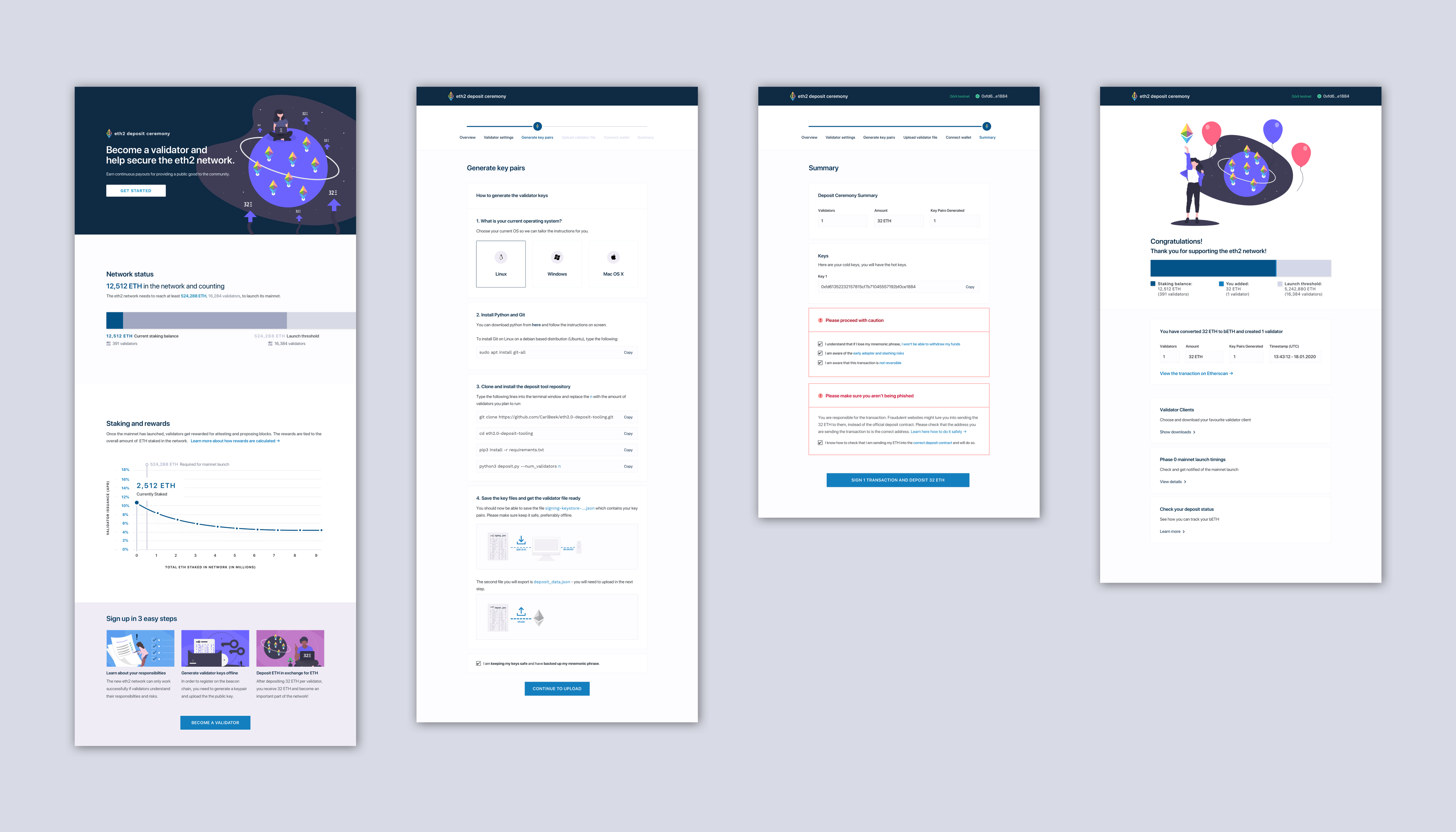 Прототип интерфейса депозитного контракта Ethereum 2.0, пошагово описывающий процесс присоединения валидаторов к Proof-of-Stake-сети Beacon Chain, был выложен в открытый доступ. Опубликовала его команда Deep Work Studio, подготавливающая эфир к переходу на новую систему.