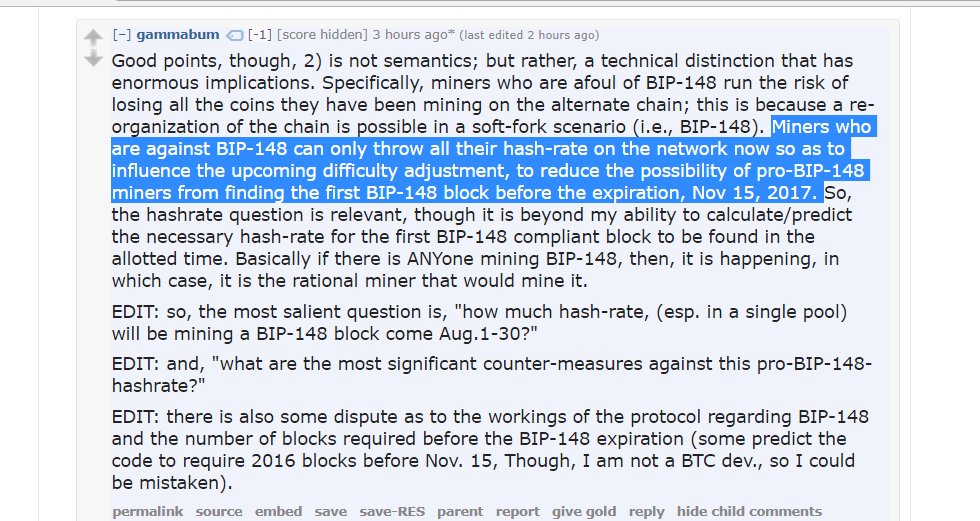 В частности, высказывается предположение, что майнеры, выступающие против активируемого пользователями софтфорка (UASF), увеличивают вычислительные мощности в надежде снизить возможность нахождения первого блока BIP-148 в период до 15 ноября, даты вероятного хардфорка в случае реализации предложения SegWit2x.