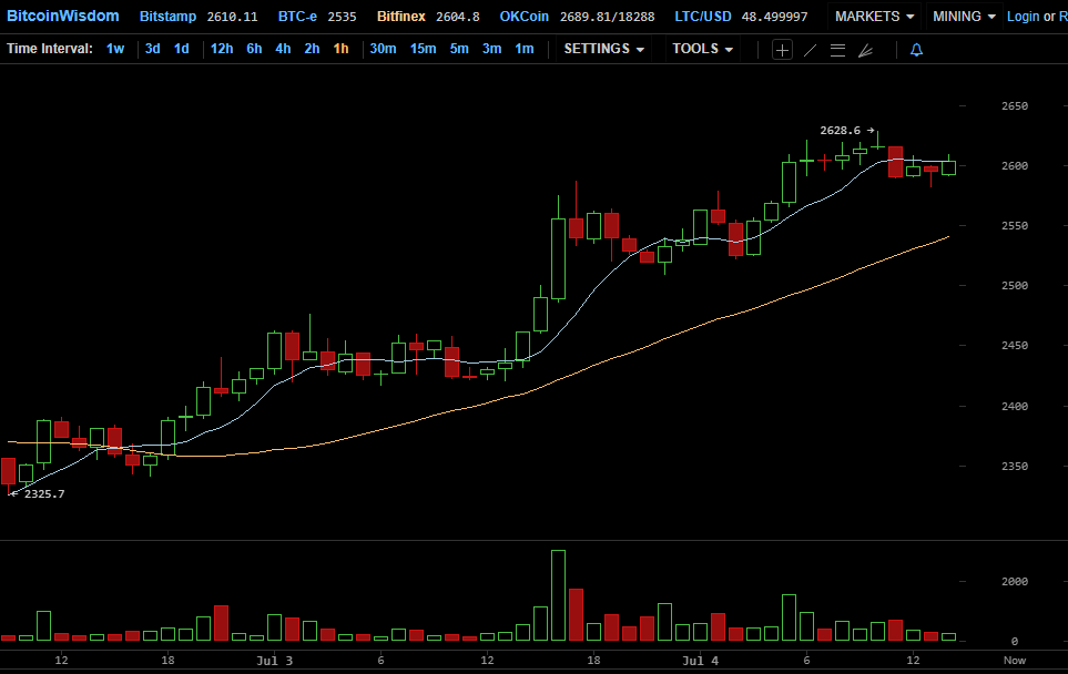 Цена биткоина тем временем поднималась в понедельник вплотную до $2600, а в ночь на вторник преодолела и этот уровень сопротивления.