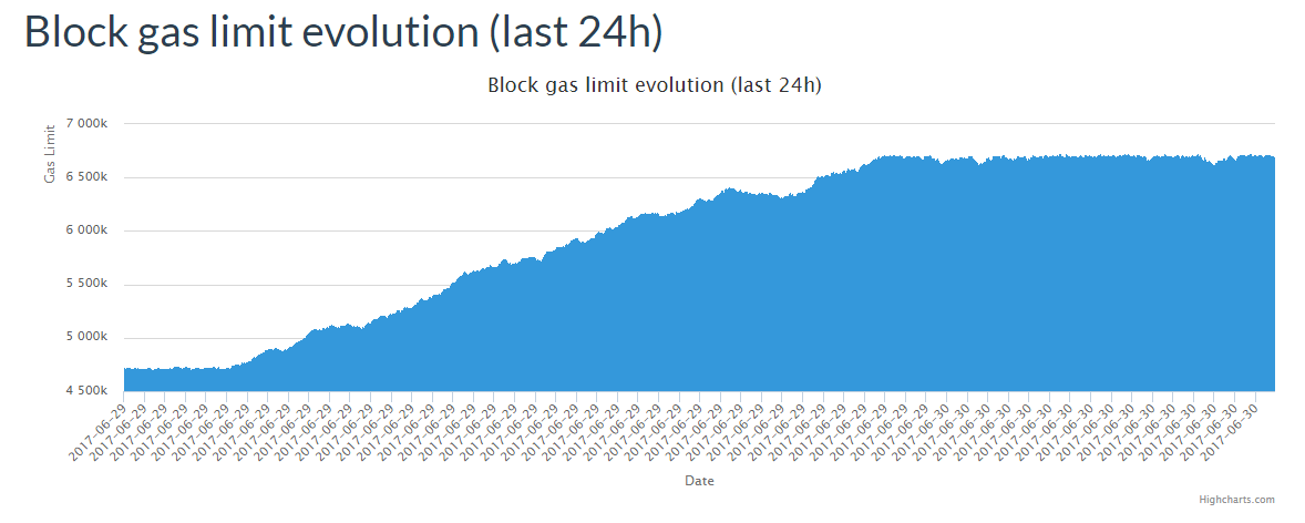 На фоне перегруженности блокчейна Ethereum майнеры начали увеличивать пропускную способность транзакций. Как пишет CoinDesk со ссылкой на данные аналитической платформы Etherchain, начиная с четверга, 29 июня, наблюдается значительный рост лимита газа в блоках сети Ethereum.