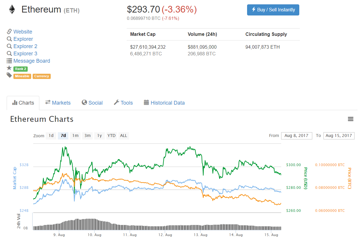Тем не менее, несмотря на возросшую активность, цена Ether, по данным Coinmarketcap, за последние сутки снизилась более чем на 3% и находится по состоянию на утро вторника, 15 августа, в районе $293. Рыночная капитализация Ethereum на данный момент оценивается в $27, 6 млрд, что составляет около 20% от совокупной капитализации всех криптовают.