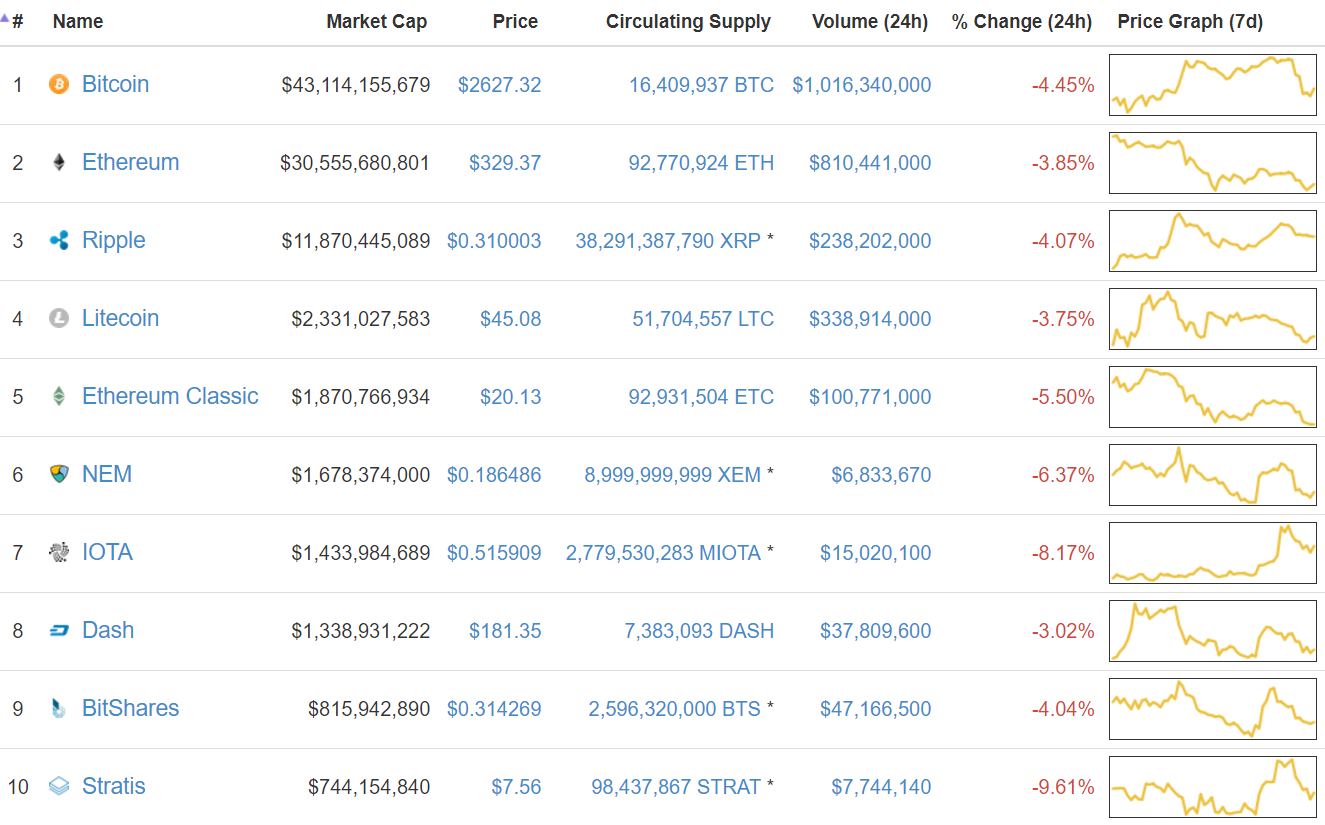 На момент публикации (09:30 Киев / Москва) средневзвешенный курс биткоина составляет $2617, Ethereum — $329, Ripple — $0.310003, Litecoin — $45.08, Ethereum Classic — $20.13.