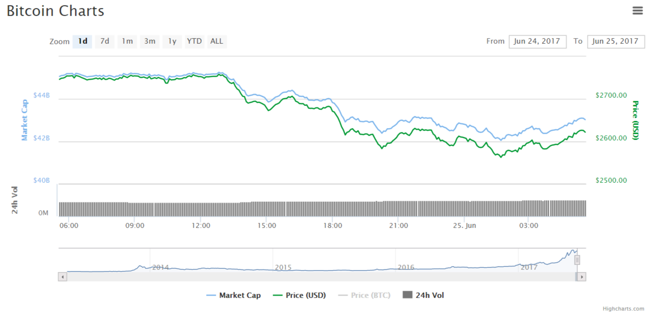 Снижение курса биткоина началось во второй половине субботы, 24 июня, и продолжалось до раннего утра воскресенья. В какой-то момент средневзвешенный курс первой криптовалюты опустился до $2562, рыночная капитализация, еще сутки назад превышавшая $45 млрд, опускалась до $42 млрд.