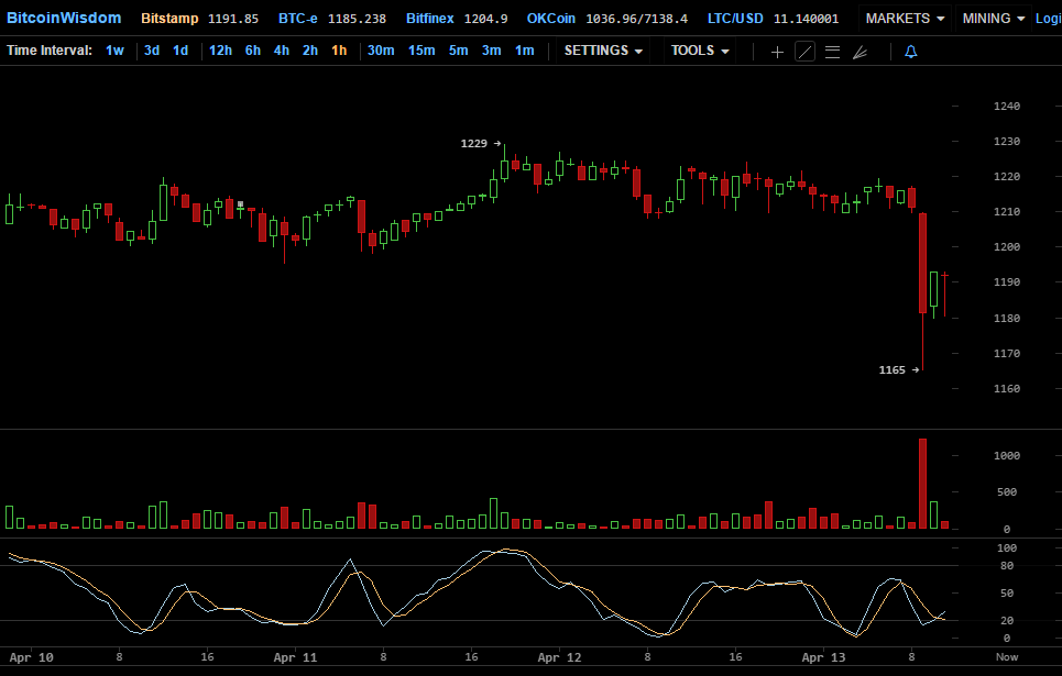 На фоне заявления Ван Чуня утром в четверг можно было наблюдать значительную коррекцию цены первой криптовалюты. Наиболее ярко она была заметна на часовом графике биржи Bitstamp, где цена достигла нижнего значения в $1165, но потом начала активное восстановление.