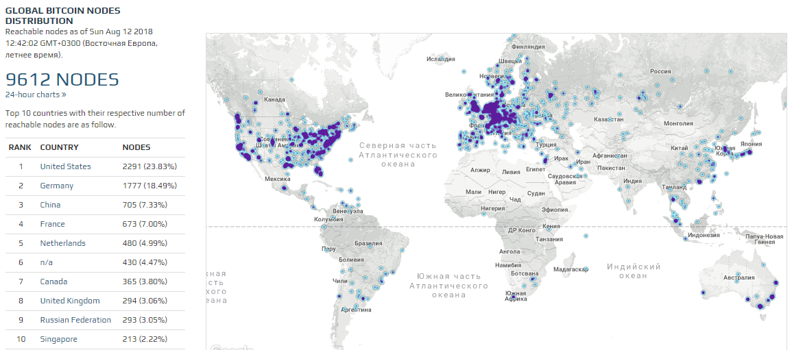 Для сравнения, сеть биткоина представлена в настоящее время 9612 нодами. При этом большая их часть расположена в США: