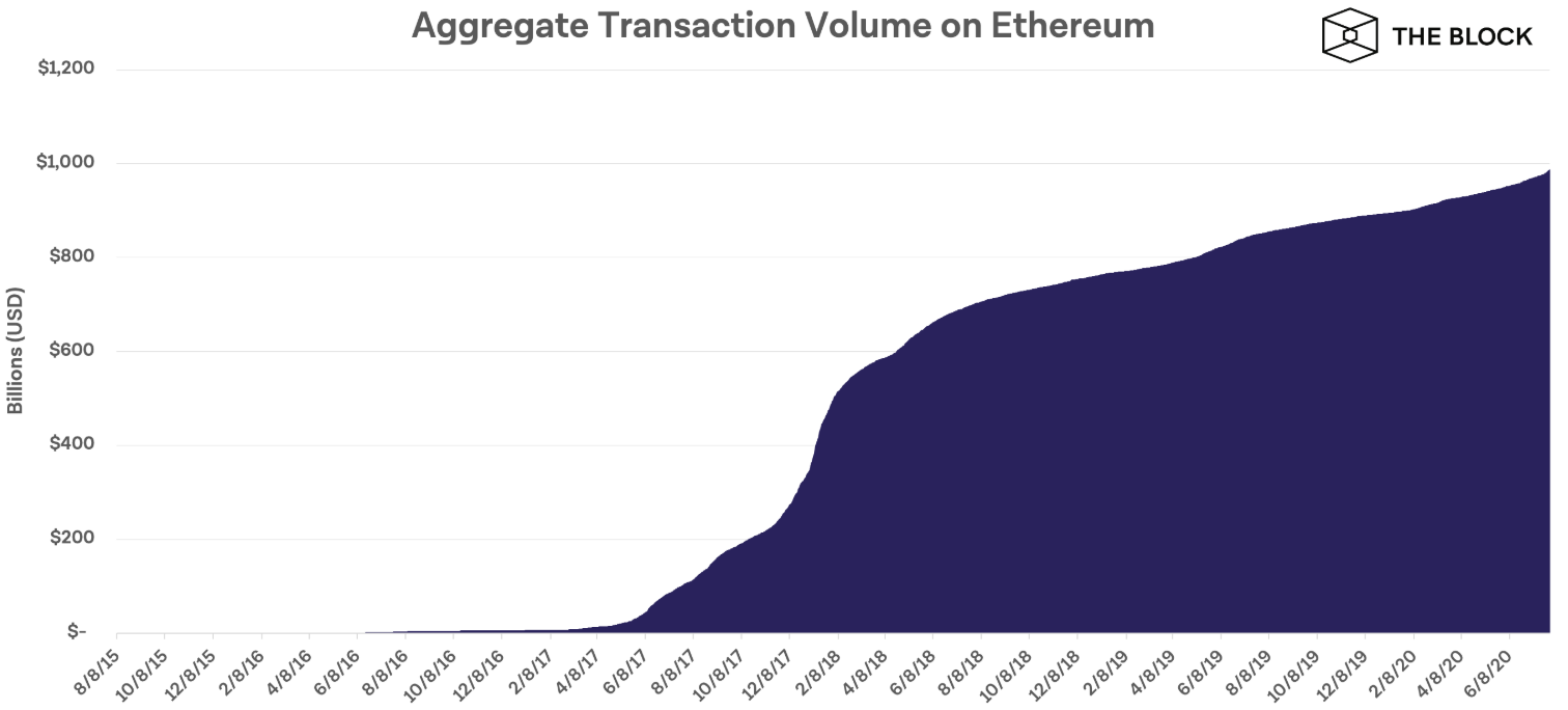 С момента появления Ethereum в июле 2015 года суммарный объем переданной через ее сеть стоимости достиг $986 млрд. Об этом сообщает The Block со ссылкой на данные аналитической компании CoinMetrics.