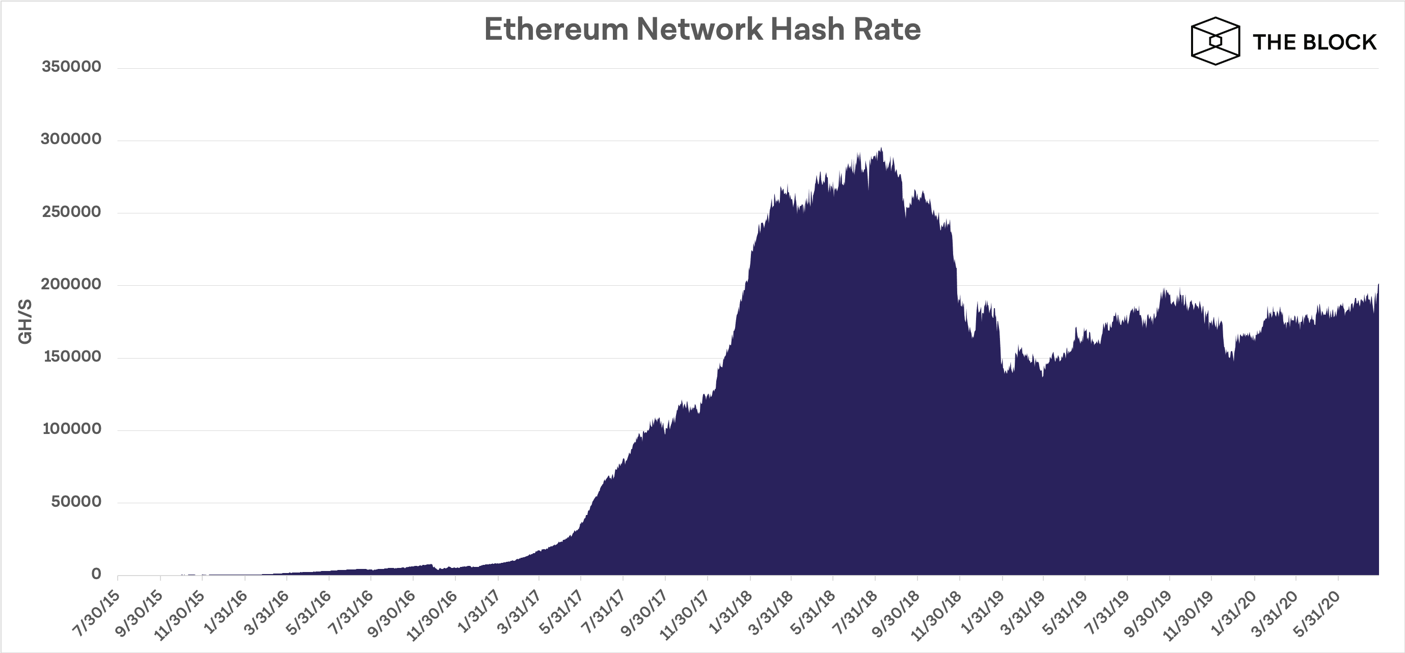 Хешрейт Ethereum достиг максимума в 2018 году, приблизившись к отметке 300 000 GH/s. На текущий момент этот показатель находится у отметки 200 000 GH/s.