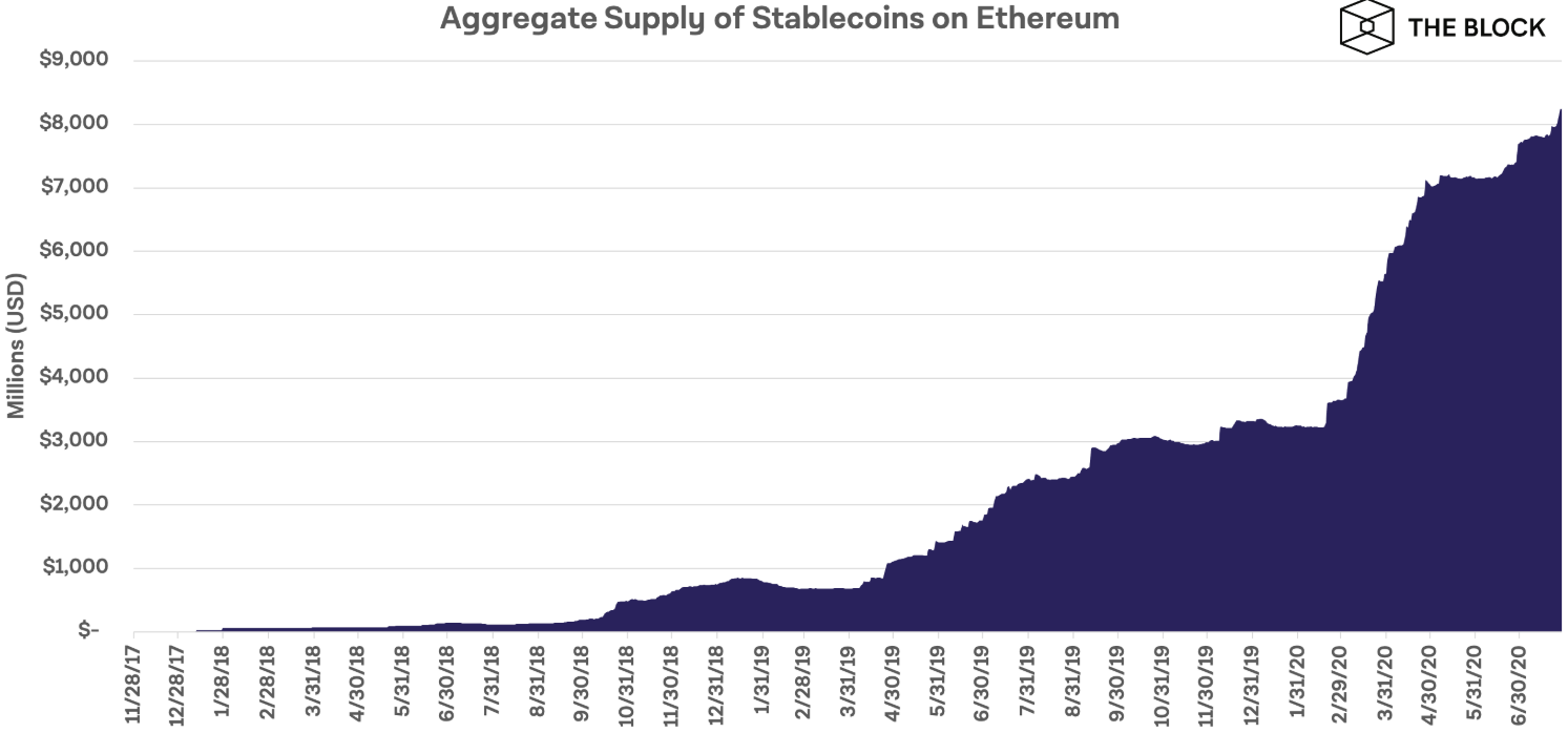 Общая капитализация выпущенных на блокчейне Ethereum стейблкоинов в этом году превысила $8 млрд, увеличившись почти втрое с начала января.