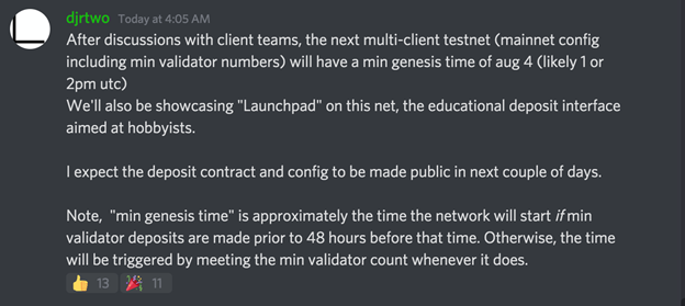 Decrypt приводит скриншот переписки Райана с коллегами в Discord, в которой он делится своими мыслями в отношении тайминга запуска мультиклиентской тестовой сети. Ее генезис-блок может быть заложен в 13:00 или 14:00 UTC 4 августа. В ней предусмотрят возможность внесения депозитов в образовательных целях. Подробности будут раскрыты позже.