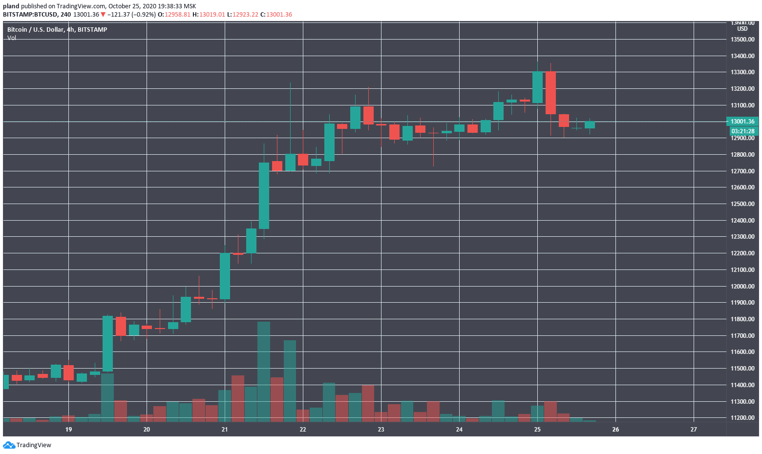 В результате коррекции котировки биткоина откатились к уровню $12 800, но тенденция к росту сохранилась. После периода консолидации утром 25 октября цена снова совершила рывок и обновила максимум 2020 года — на этот раз превысив $13 360.