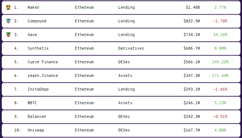 Протокол Aave увеличил объем заблокированных средств на 34% за последние 24 часа, доведя этот показатель до $734 млн, и вышел на третье место.