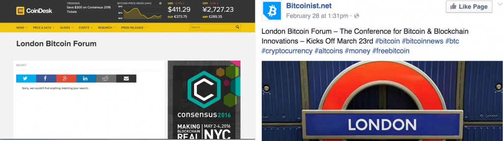Пресс-релизы о проведении London Bitcoin Forum впервые появились в конце февраля и были опубликованы рядом известных изданий, включая Bitcoinist, CoinDesk и BraveNewCoin. Само мероприятие, как утверждалось, должно было пройти 23 и 24 марта в британской столице. Анонсировалось участие более 900 человек, включая 60 заявленных спикеров и экспертов индустрии. Среди заявленных тем форума назывались дискуссии о масштабируемости сети биткоина и увеличении размера блока, а также обсуждение вопросов регулирования в Великобритании и других странах.