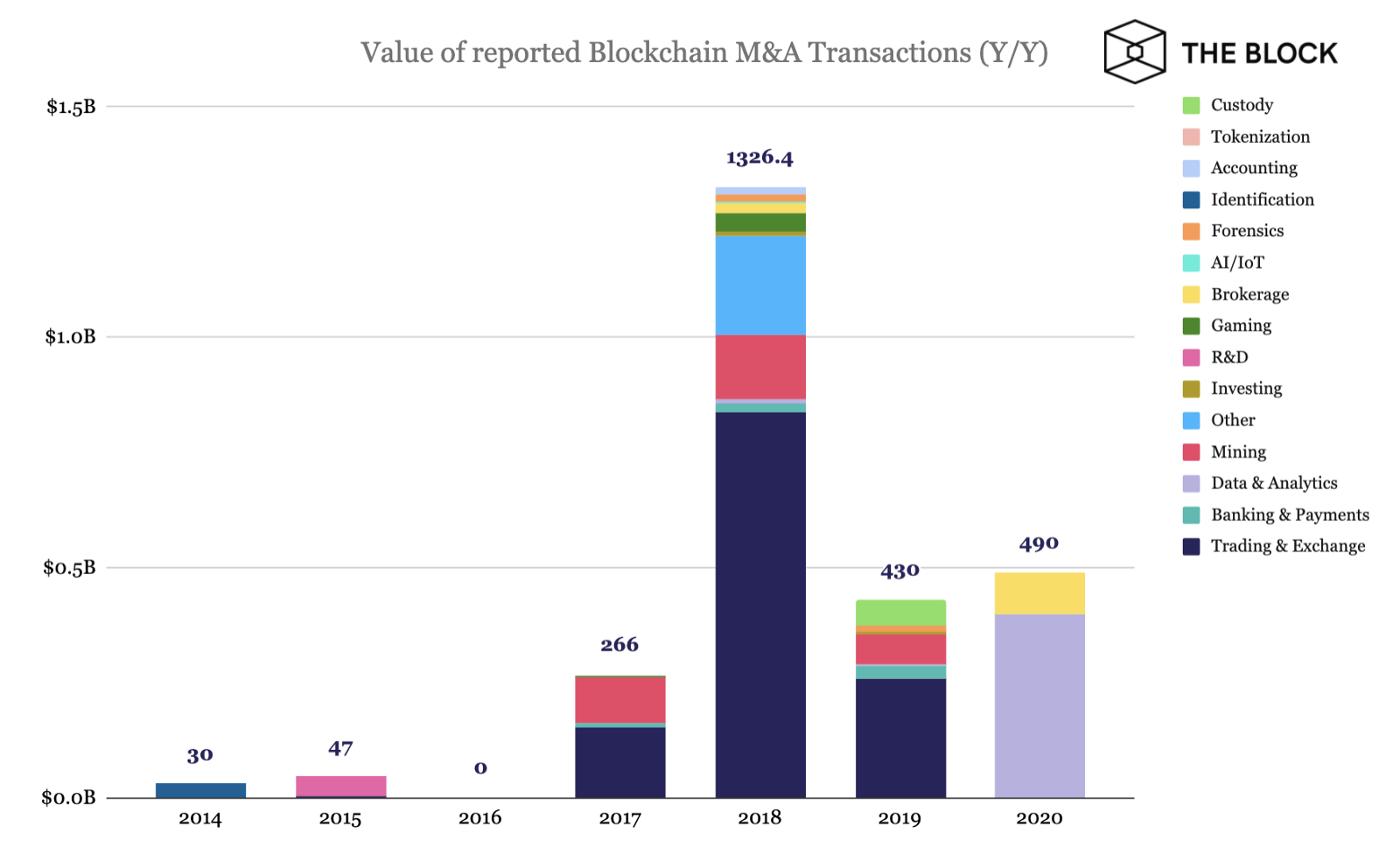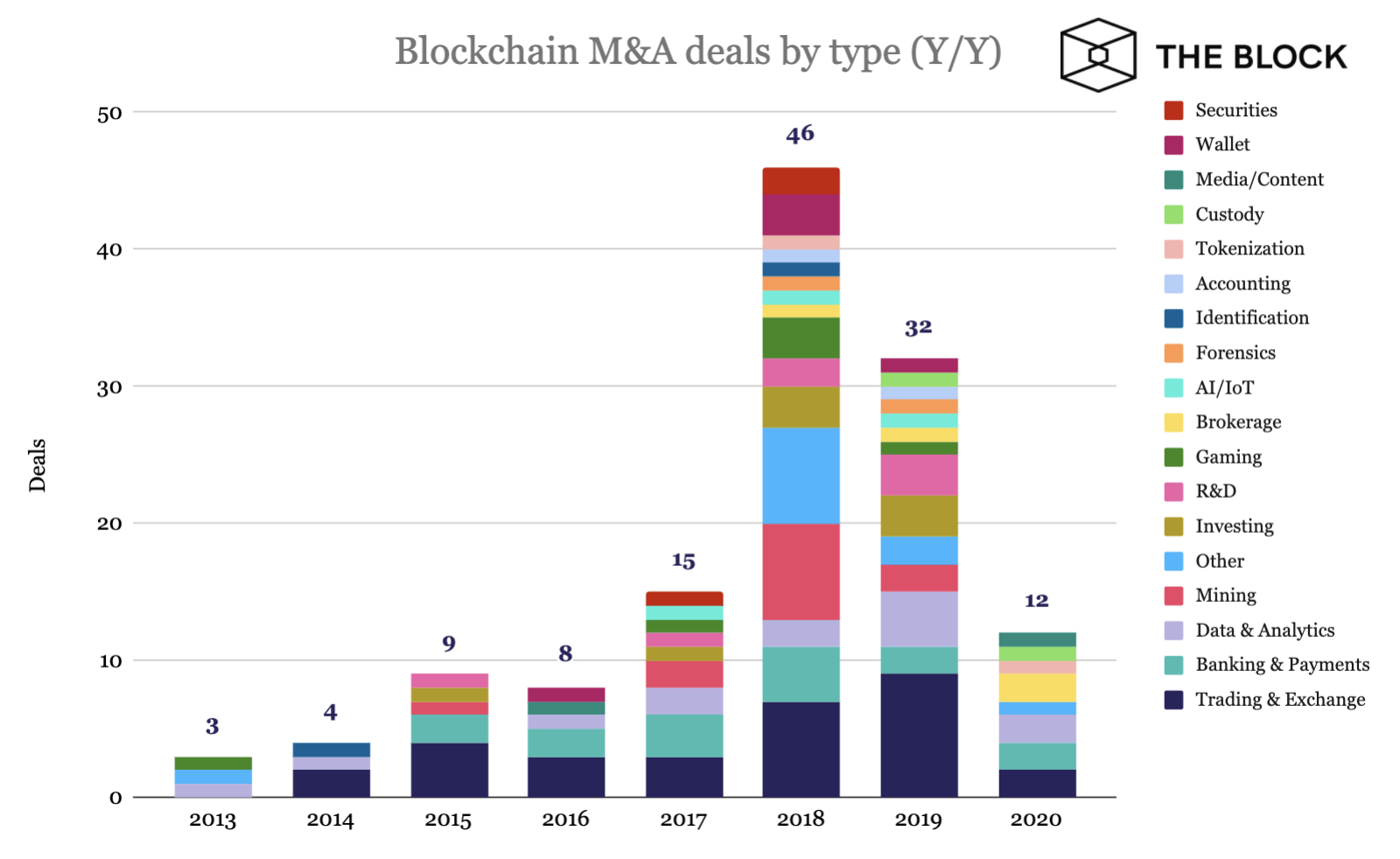С 2013 года в криптоиндустрии состоялось 129 M&A-сделок на общую сумму $2,6 млрд. Наибольший всплеск активности в этой сфере наблюдался в 2018 году. Тогда общая сумма сделок подскочила на 400% — с $266 млн до примерно $1,3 млрд.