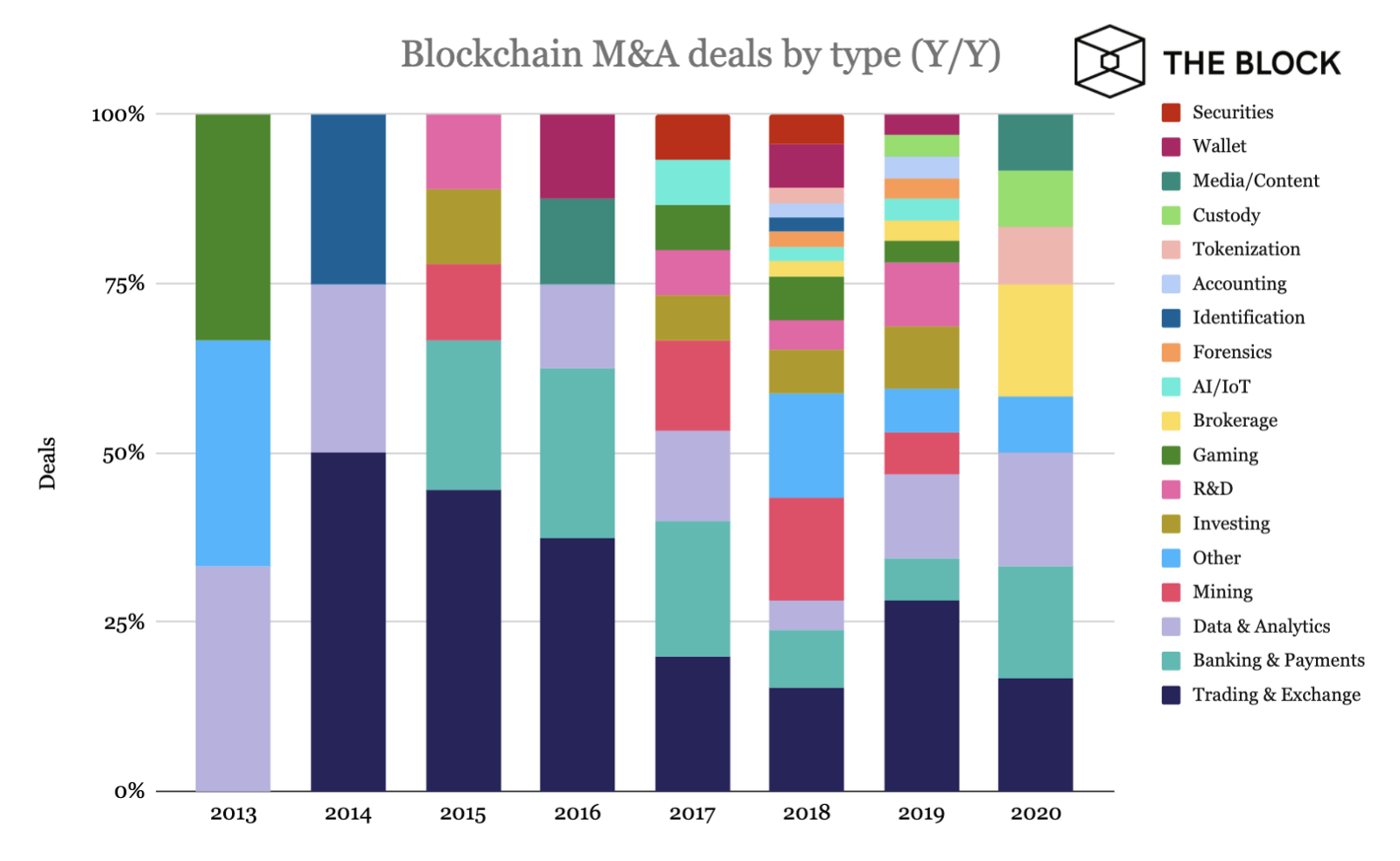 На следующей диаграмме заметен постепенный спад доли трейдинговых решений, майнинга, а также банкинга и платежей в общем количестве слияний и поглощений.