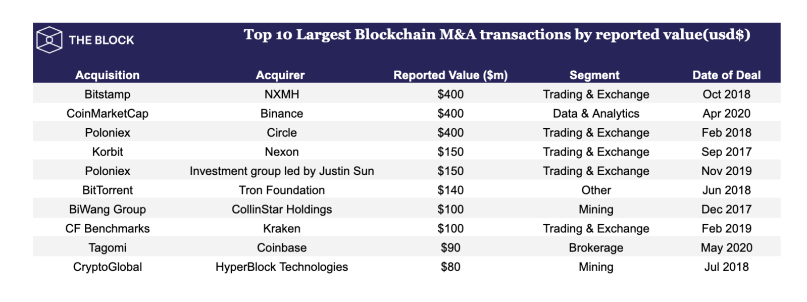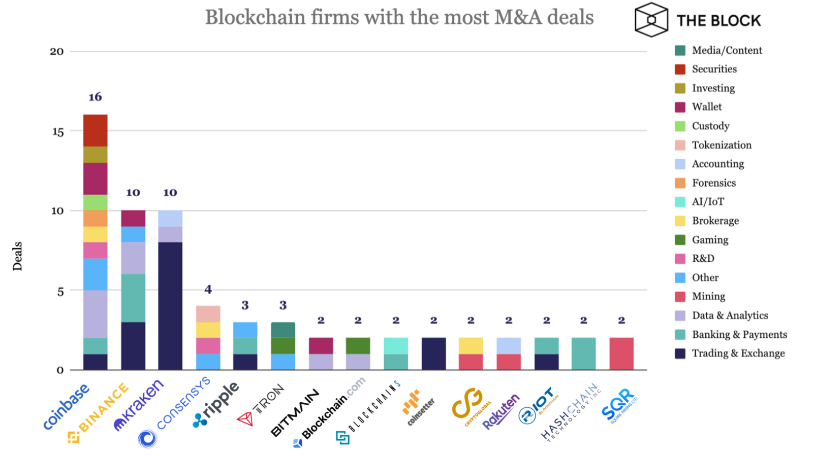 Популярные биткоин-биржи Coinbase, Kraken и Binance — наиболее активны в сфере слияний и поглощений (M&A). Каждая из компаний закрыла не менее 10 подобных сделок, констатирует исследователь The Block Джон Дантони.
