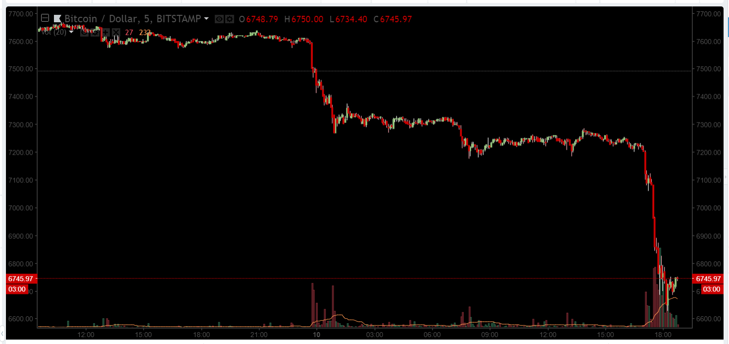 По состоянию на 18:30 UTC средневзвешенный курс биткоина, по данным CoinMarketCap, составлял $6777. Перед этим цена первой криптовалюты опускалась до $6700 на Bitstamp.