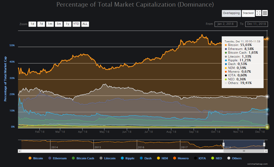 Стоит отметить, что в самом начале 2018 года доля BTC на рынке падала до рекордно низких значений. Так, 4 января индекс доминирования биткоина достигал 32,68%.