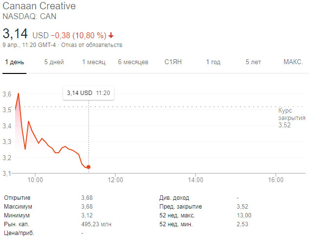 В ноябре прошлого года фирма стала первопроходцем, первой из крупных производителей майнеров выйдя на IPO. Canaan разместила 10 млн акций по цене $9. Но уже к середине декабря стоимость ценных бумаг обвалилась на 40%. В 2020 году падение продолжилось, но в начале февраля этого года цена внезапно подскочила на более чем 82% до $8 за акцию.