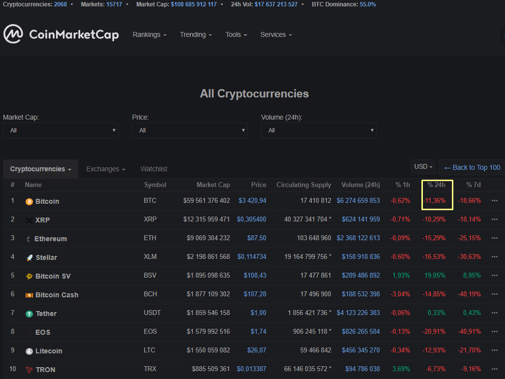 Как обычно, вместе с биткоином упало в цене большинство остальных представителей первой десятки CoinMarketCap: