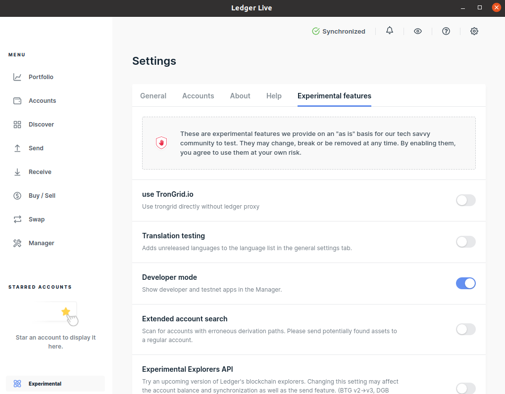 Подсоедините Ledger к компьютеру, откройте приложение Ledger Live и включите Developer mode в настройках.