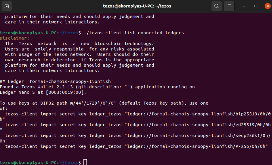 Закройте Ledger Live, а на кошельке Ledger запустите Tezos Baking App. Перейдите в терминал с tezos-client и найдите устройство: