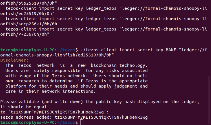 ./tezos-client import secret key [псевдоним аккаунта, к которому привяжется ключ] “[адрес Ledger]”