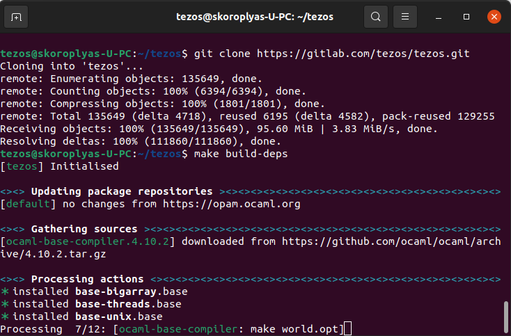 Если терминал выдаст ошибку про отсутствующий репозиторий — загрузите tezos.git повторно, а затем выполните make build-deps: