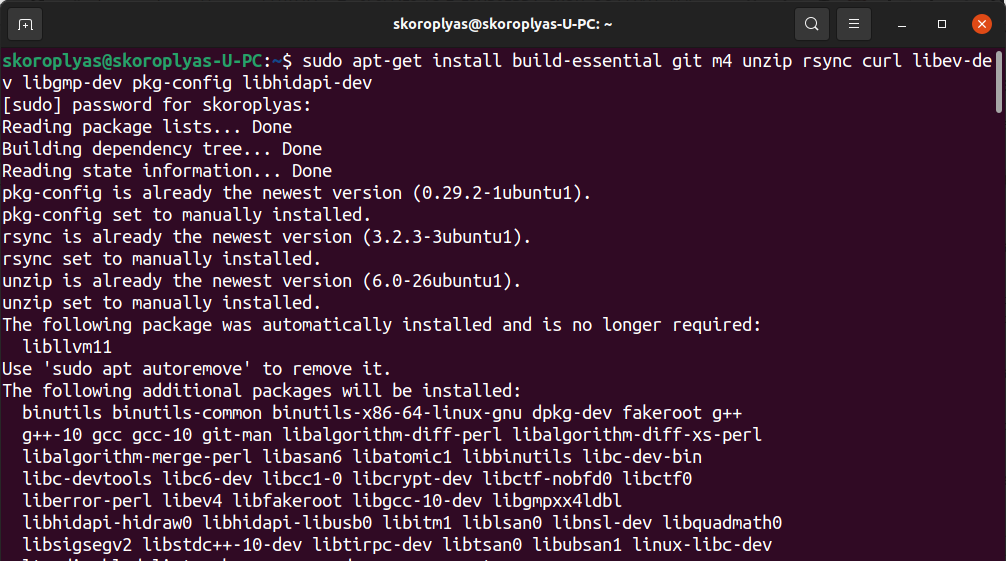 sudo apt-get install build-essential git m4 unzip rsync curllibev-dev libgmp-dev pkg-config libhidapi-dev