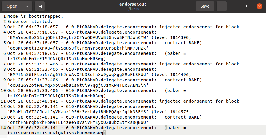 Демон baker будет записывать логи создания и подтверждения блоков в файл baker.out в папке Tezos. Его можно открыть любым текстовым редактором.
