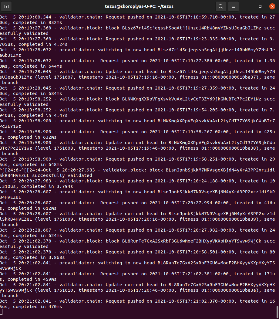 Этот терминал начнет выдавать процесс загрузки блоков. В каждой новой строке терминал будет указывать две отметки: текущее время и timestamp блока. По ним можно оценить, сколько займет полная синхронизация.