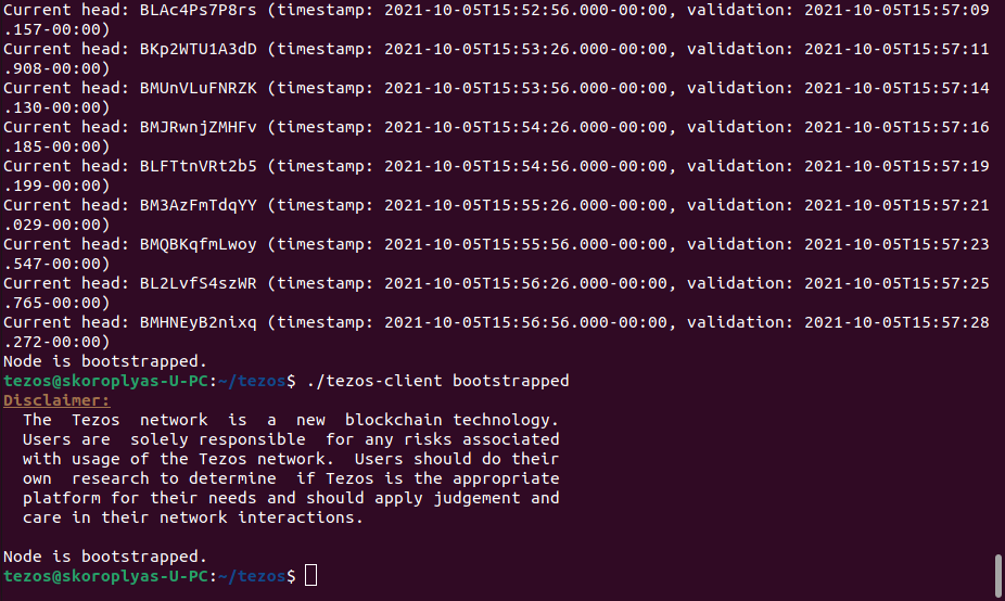 Когда узел полностью синхронизируется, терминал выдаст сообщение “node is bootstrapped”.