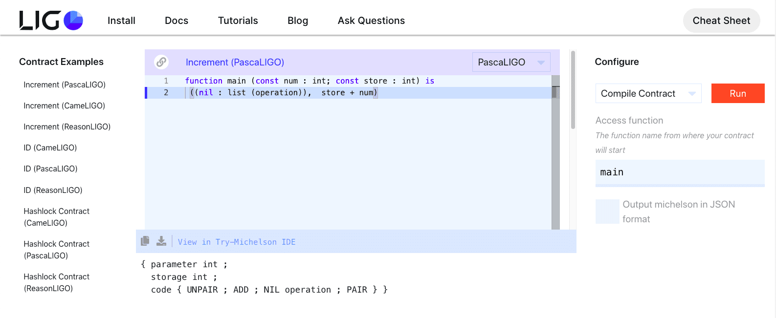 Вставьте код в редактор, в выпадающем списке выберите пункт Compile Contract и нажмите кнопку Run. Компилятор выдаст код контракта на языке Michelson.