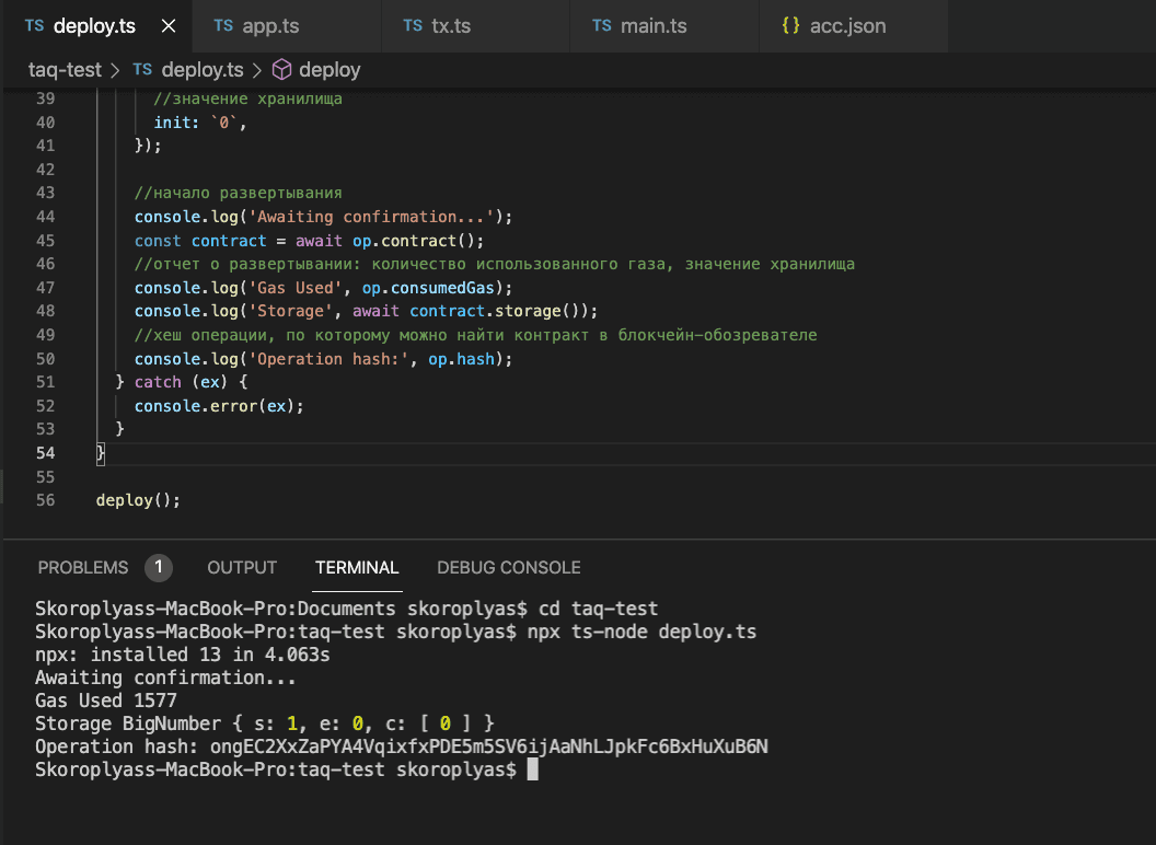 deploy()Откройте консоль и выполните команду npx ts-node deploy.ts. Терминал выдаст отчет о публикации контракта.